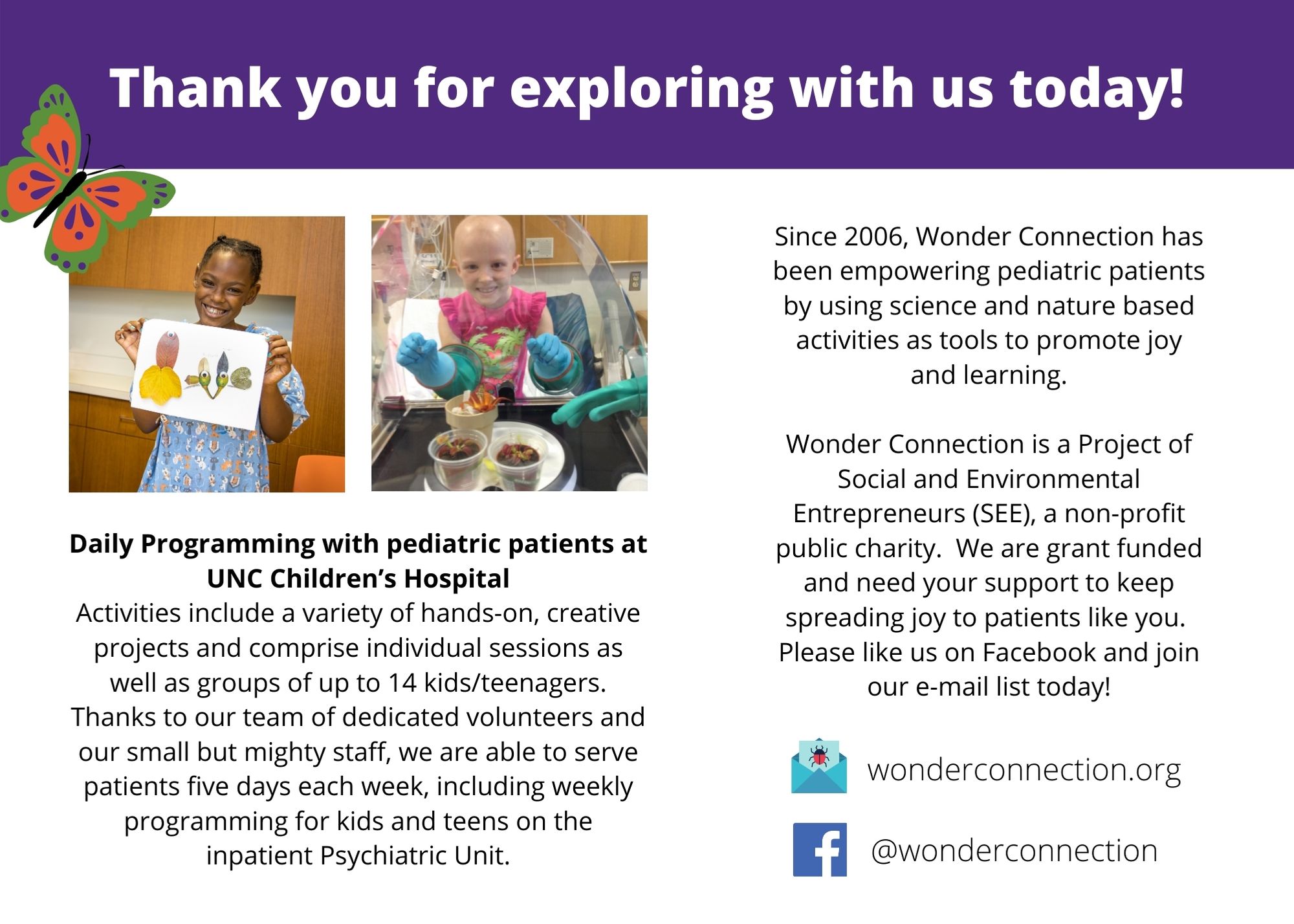 The Wonder Connection is a project through the organization SEE that brings natural science experiments to children in the hospital in North Carolina. This organization has been a blast to work with. Their team is incredibly responsive and always very understanding. They also have one of my favorite color palettes to work with. Plus, I love being able to decorate print pieces with little butterflies and caterpillars.