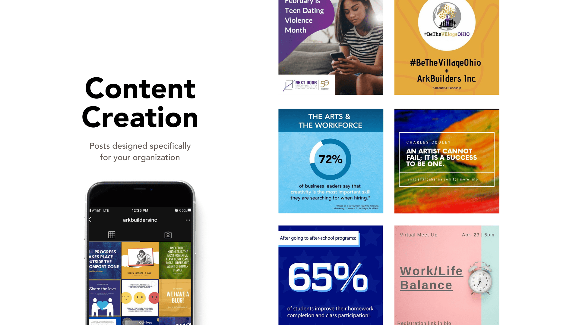 Get expert graphics for your organization’s social media with 20 posts a month that fit your brand. Depending on your organization’s needs, the amount of graphics can be a combination of any of these types of content: